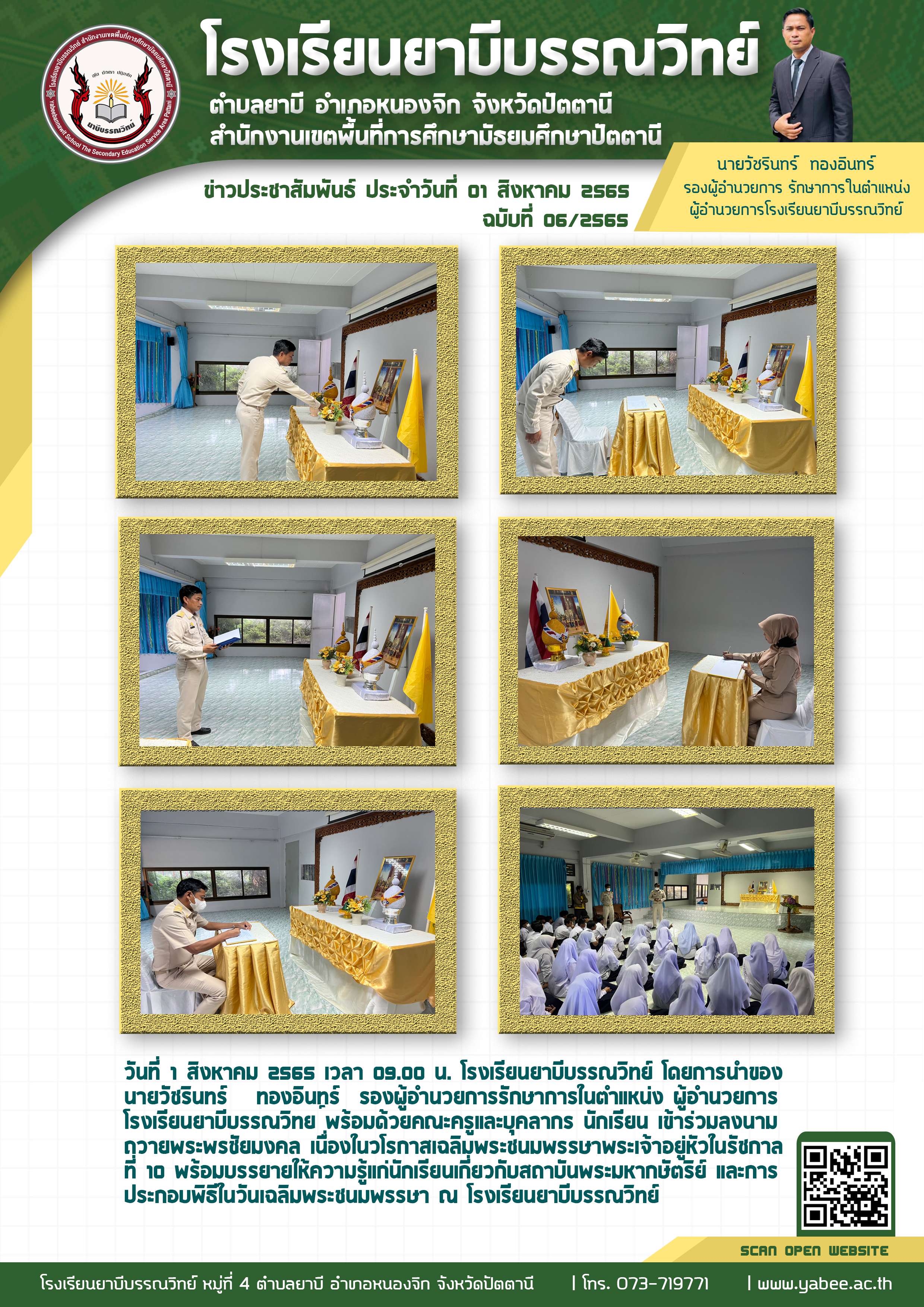 วันที่ 01 สิงหาคม พ.ศ.2565 รองผู้อำนวยการ และคณะครูโรงเรียนยาบีบรรณวิทย์ เข้าร่วมลงนามถวายพระพรชัยมงคลเนื่องในโอกาส เฉลิมพระชนมพรรษาพระเจ้าอยู่หัว รัชการลที่ 10 ณ โรงเรียนยาบีบรรณวิทย์